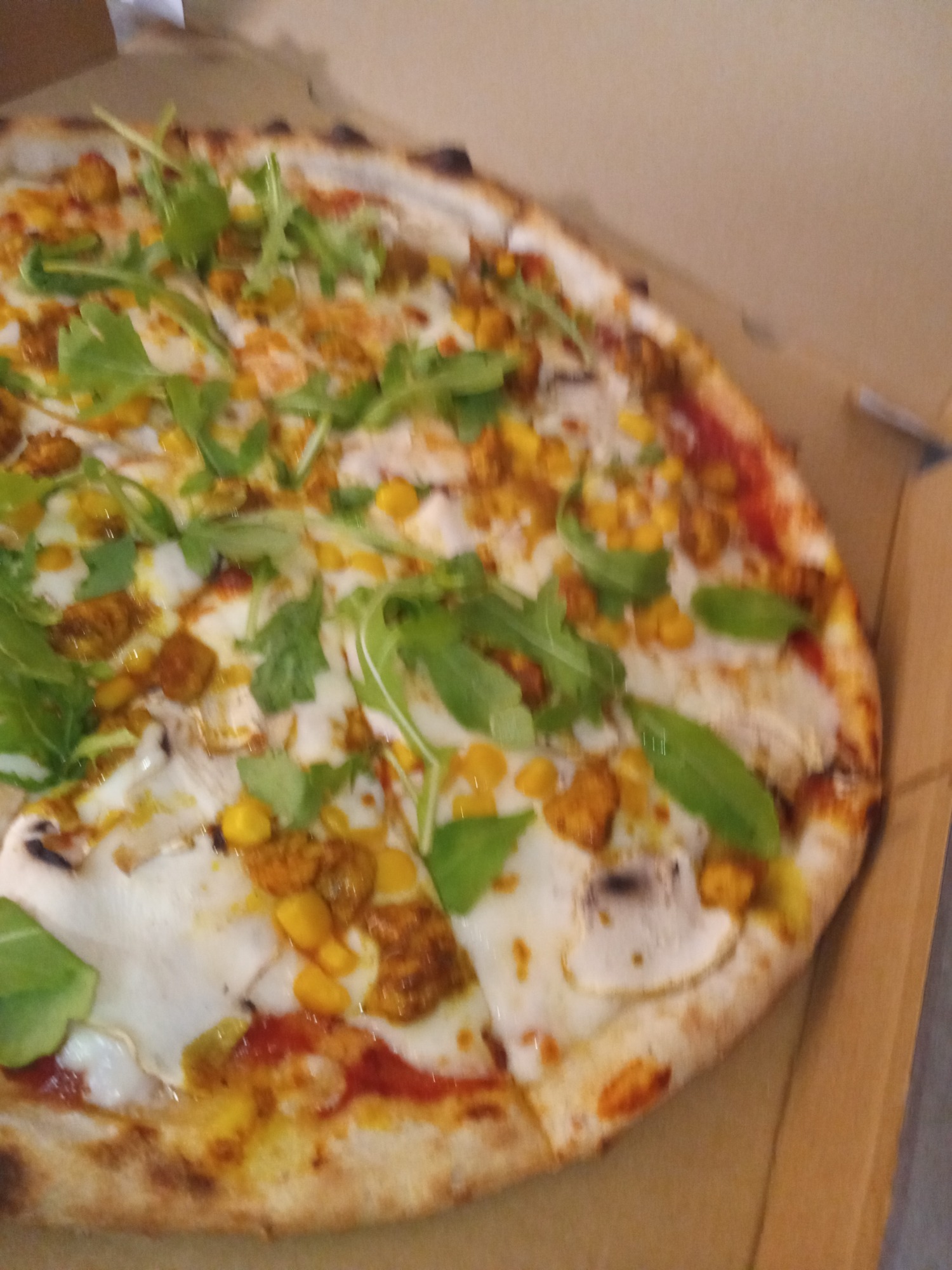 sos pomidorowy podwójnie , ser, pieczarki, kurczak curry, cebula -